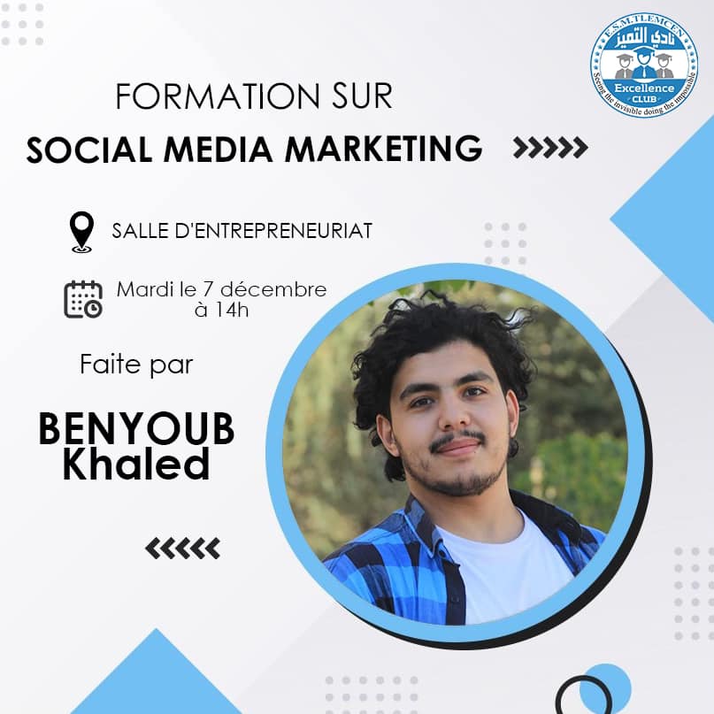 Bonsoir excellence family! Vous voulez en savoir plus sur le marketing des réseaux sociaux ou autrement dit le E-marketing ? Alors ne ratez pas la formation ''Social Media Marketing'' animée par Monsieur Benyoub Khaled qui aura lieu ce mardi à 14h au niveau de l'ESM. On vous attends en salle d’entreprenariat Soyez a l'heure .